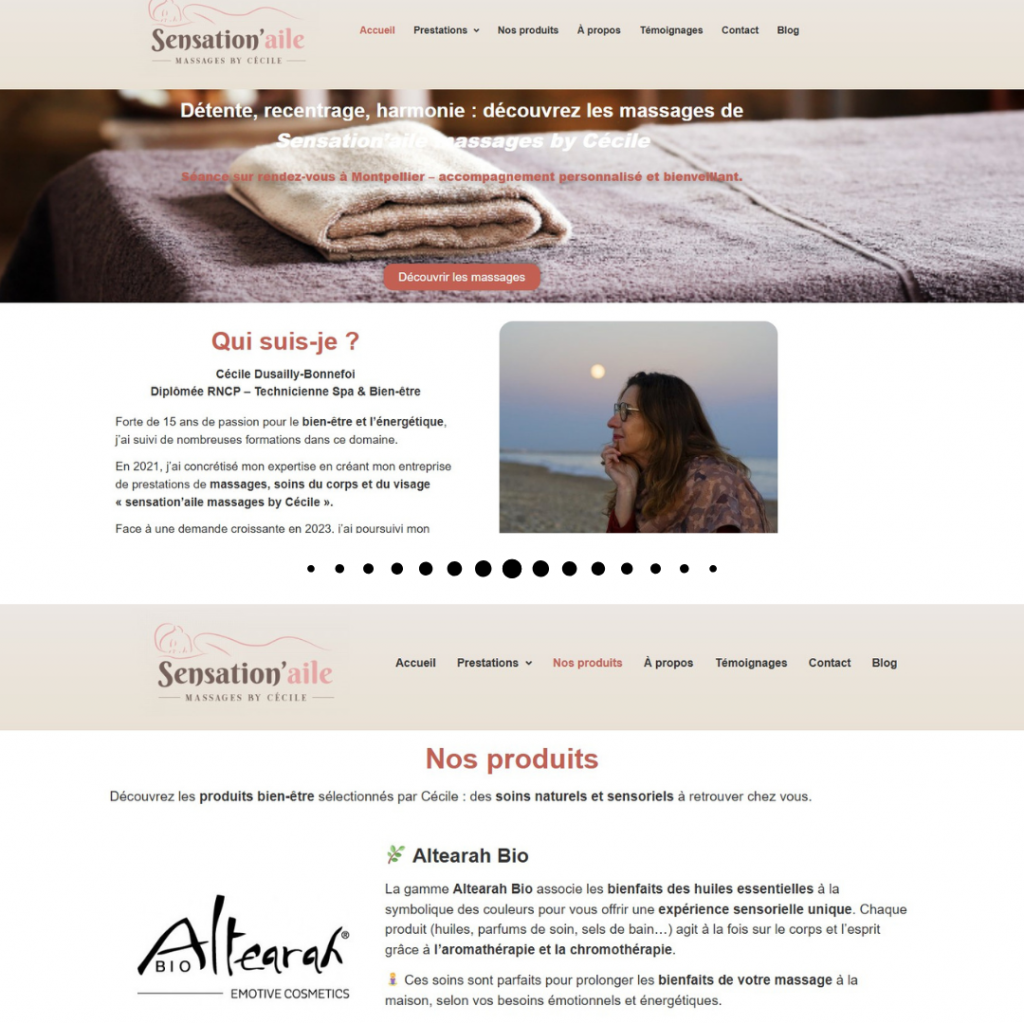 Site vitrine dédié aux massages bien-être à Lattes, près de Montpellier, avec intégration de Kalendes pour la prise de rendez-vous en ligne. Design chaleureux et optimisé pour le référencement local.